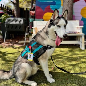 Charlie was adopted from the SPCA of Tampa Bay and is a gentle, playful husky whose affectionate heart is just as impressive as his fluffy size. Specially trained to help mitigate and interrupt self-harm behaviors, Charlie provides comfort, safety, and grounding support to those he works with. He considers himself a lapdog and loves nothing more than being close to humans, leaning into snuggles, belly rubs, and bringing smiles. With his playful spirit and loyal nature, Charlie provides joy, reassurance, and unconditional love to every child and family he meets.